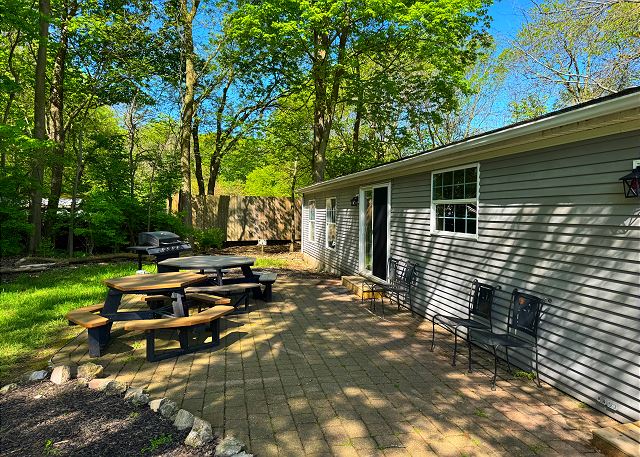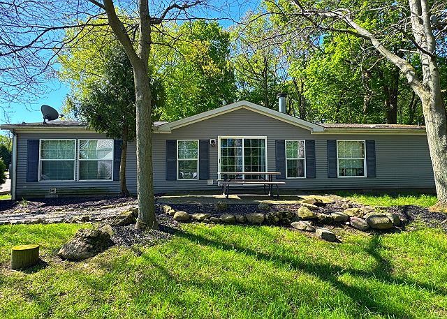 Privacy is the key with this great Put-in-Bay vacation home. Located in a private section of Jeris Lane (second house on the left past the little shed), this home sleeps up to twelve guests with the four bedrooms and two baths. Park your car in the concrete driveway, with space for up to two vehicles. The door has a coded electronic door lock, making it very easy for you and your guests to access the home. Stepping inside, guests enter into the kitchen. The kitchen comes complete with everything you will need to prepare and serve a delectable meal. Cooking a meal or two during your Put-in-Bay stay is an excellent way to curb some costs. There is a dining room and two separate seating areas on either side of it. One seating area comes with a flat-screen television with DirecTV. There are two brick patio areas that can be accessed via sliding glass doors. One patio comes with a propane grill and outdoor seating area.