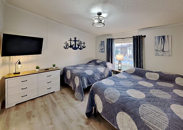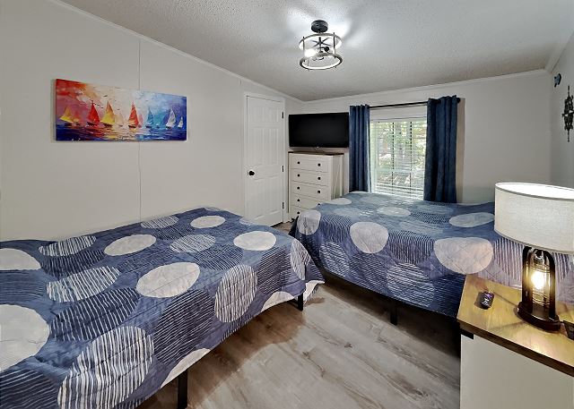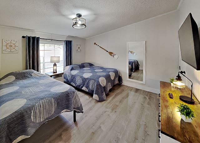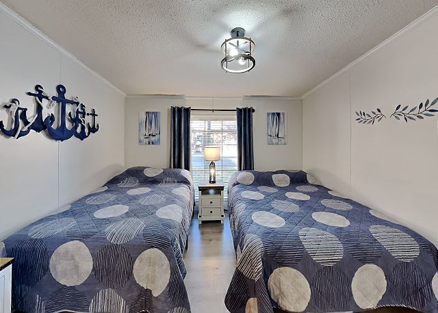 "Overall, we had a GREAT time! Management was great- easy check-in & check-out with helpful instructions. The location was a little far from town if you want to enjoy the nightlife. Our rental included a 4-person golf cart, but there was 7 of us, so we always had to make 2 trips with the cart. Each bedroom had 2 beds each, so we all had our own bed. The kitchen was equipped, but had no non-stick frying pans. Fridge worked well, but old and no rails on door. Coffee pot old, but worked. The huge grill was a BIG plus- awesome grill out on the big front deck. Air conditioning worked great. Fancy- no; more than adequate and clean- YES."