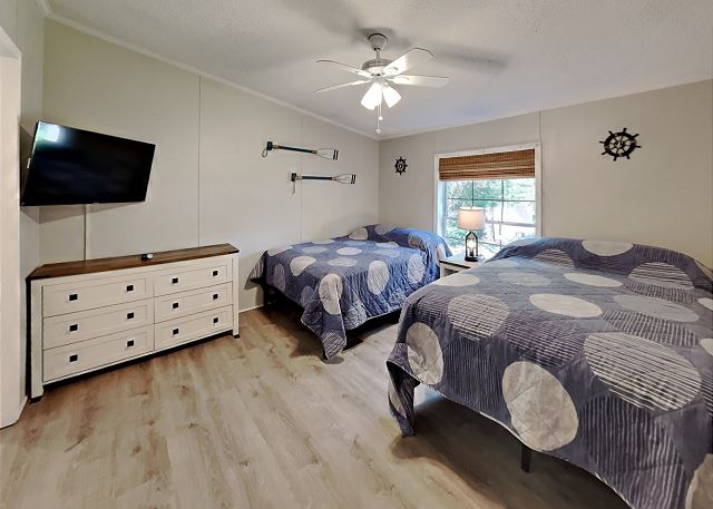 Island Club #27 is a spacious and beautifully appointed home that boasts three bedrooms and two bathrooms, providing ample space for families or groups of friends. Each bedroom is equipped with its own TV, allowing everyone to unwind and enjoy their favorite shows or movies after a day of island adventures. With sleeping arrangements for up to 10 guests, this rental ensures that everyone has a comfortable place to rest after a day of island adventures. This rental also features a fully equipped kitchen, allowing you to prepare delicious meals and dine together with your loved ones. The large front deck with a grill is perfect for grilling out on those peaceful summer evenings!