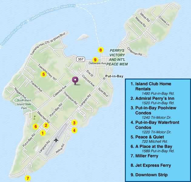 Located about halfway between Toledo Ohio and Cleveland Ohio, Put-in-Bay is located on an island in Lake Erie. Most guests and tourists arrive by ferry boat which departs from either Port Clinton or Catawba Island. Ferry routes are highlighted above.